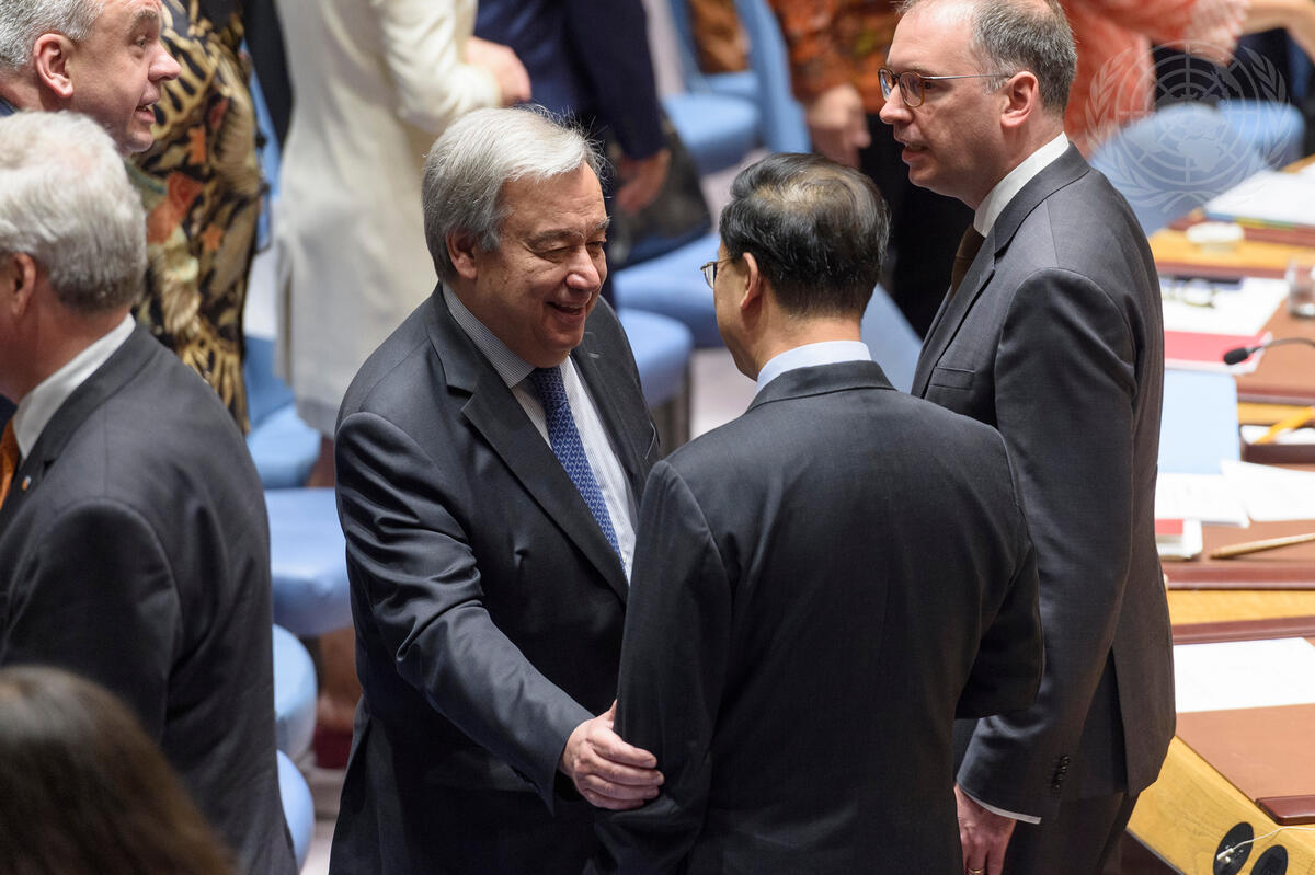 Secretary-General António Guterres (centre left) speaks with Ma Zhaoxu (centre right), Permanent Representative of China to the United Nations, and Niels Annen (right), Minister of State at the Federal Foreign Office of Germany, ahead of the Security Council debate on protection of civilians in armed conflict.