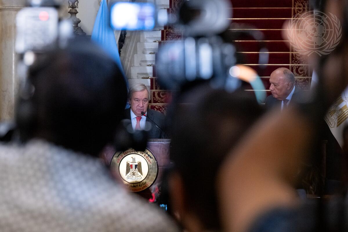 Secretary-General António Guterres (left facing the camera) briefs reporters with Sameh Hassan Shoukry Selim (right facing the camera), Minister for Foreign Affairs of the Arab Republic of Egypt, in Cairo, Egypt.