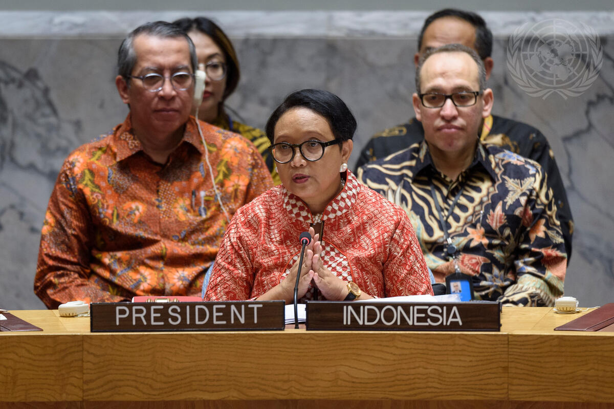 Retno Lestari Priansari Marsudi, Minister for Foreign Affairs of the Republic of Indonesia and President of the Security Council for the month of May, chairs the Security Council debate on protection of civilians in armed conflict. Behind her at left is Dian Triansyah Djani, Permanent Representative of Indonesia to the United Nations.