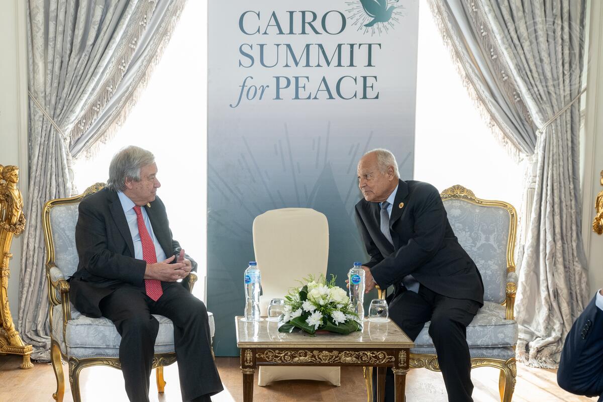 Secretary-General António Guterres (left) meets with Ahmed Aboul Gheit, Secretary General of the League of Arab States, during the Cairo Summit for Peace in Cairo, Egypt.
