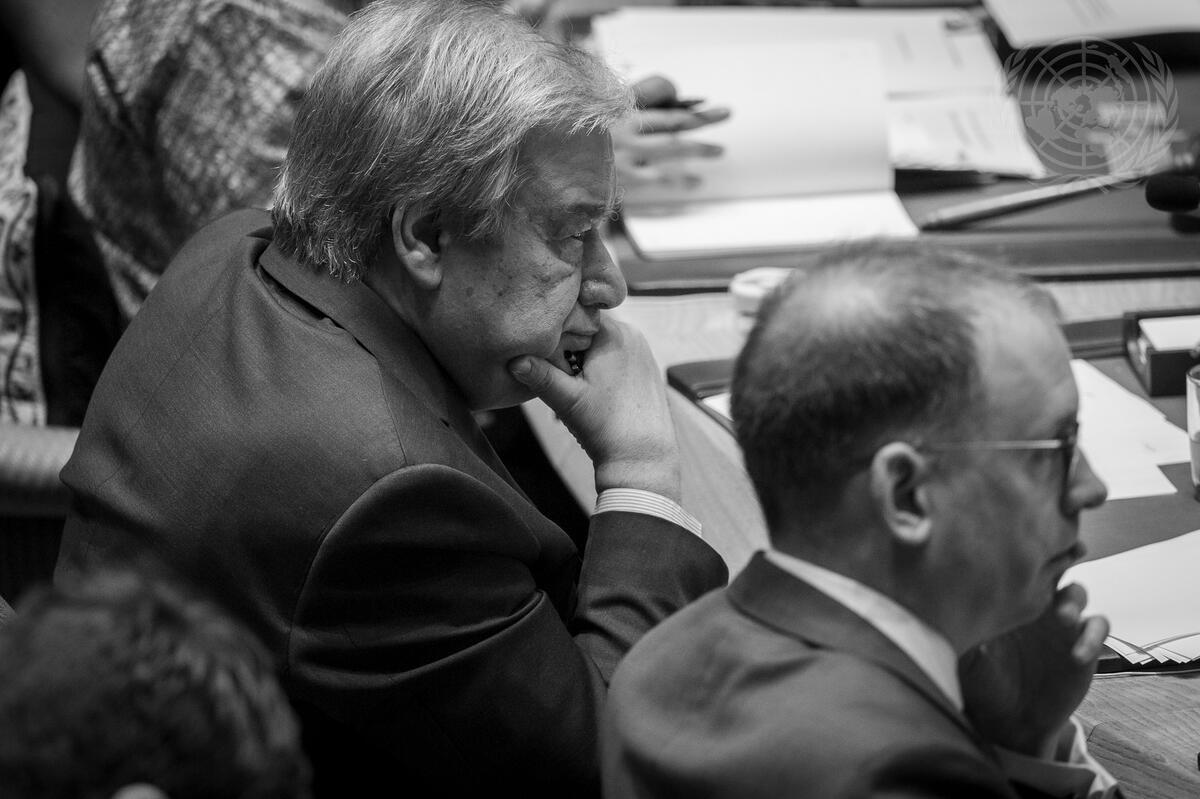 Secretary-General António Guterres (left) attends the Security Council debate on protection of civilians in armed conflict. At right is Niels Annen, Minister of State at the Federal Foreign Office of Germany.