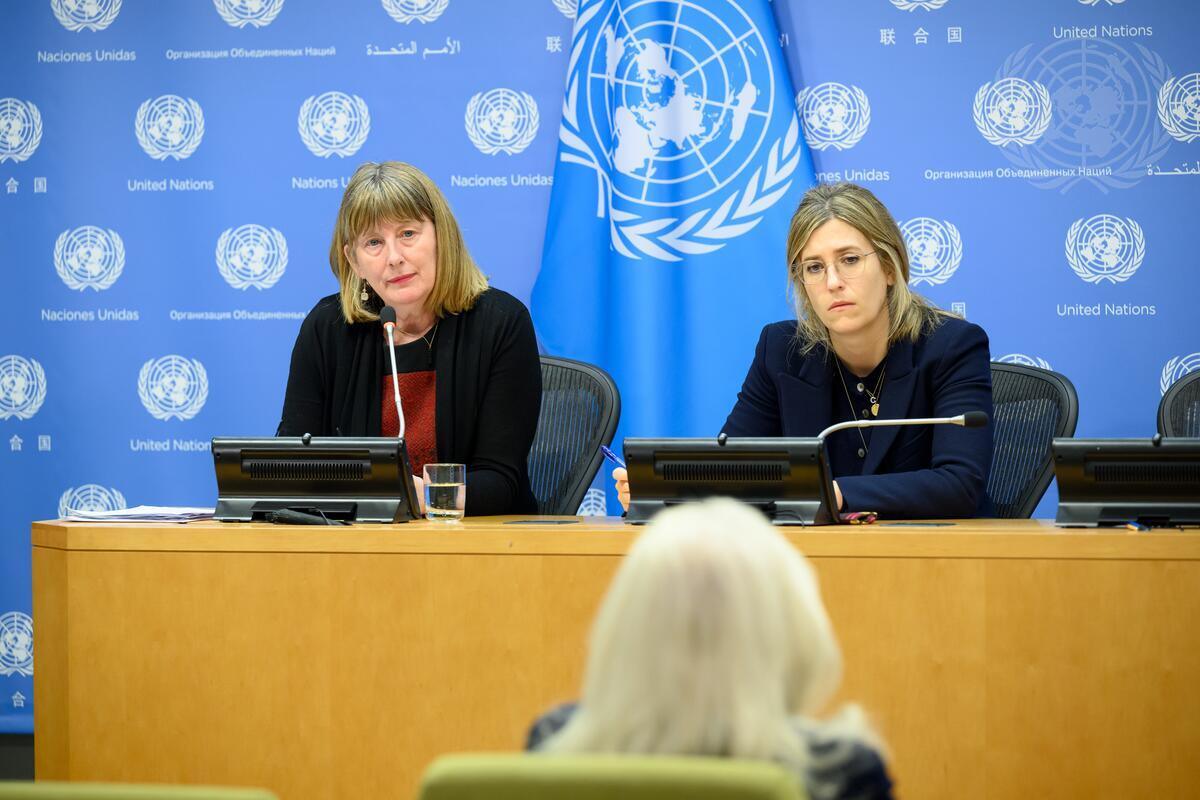 Fionnuala D. Ní Aoláin (left), Special Rapporteur on the promotion and protection of human rights and fundamental freedoms while countering terrorism, briefs reporters at UN Headquarters. At right is Adriana Edmeades Jones, Human Rights Lawyer.