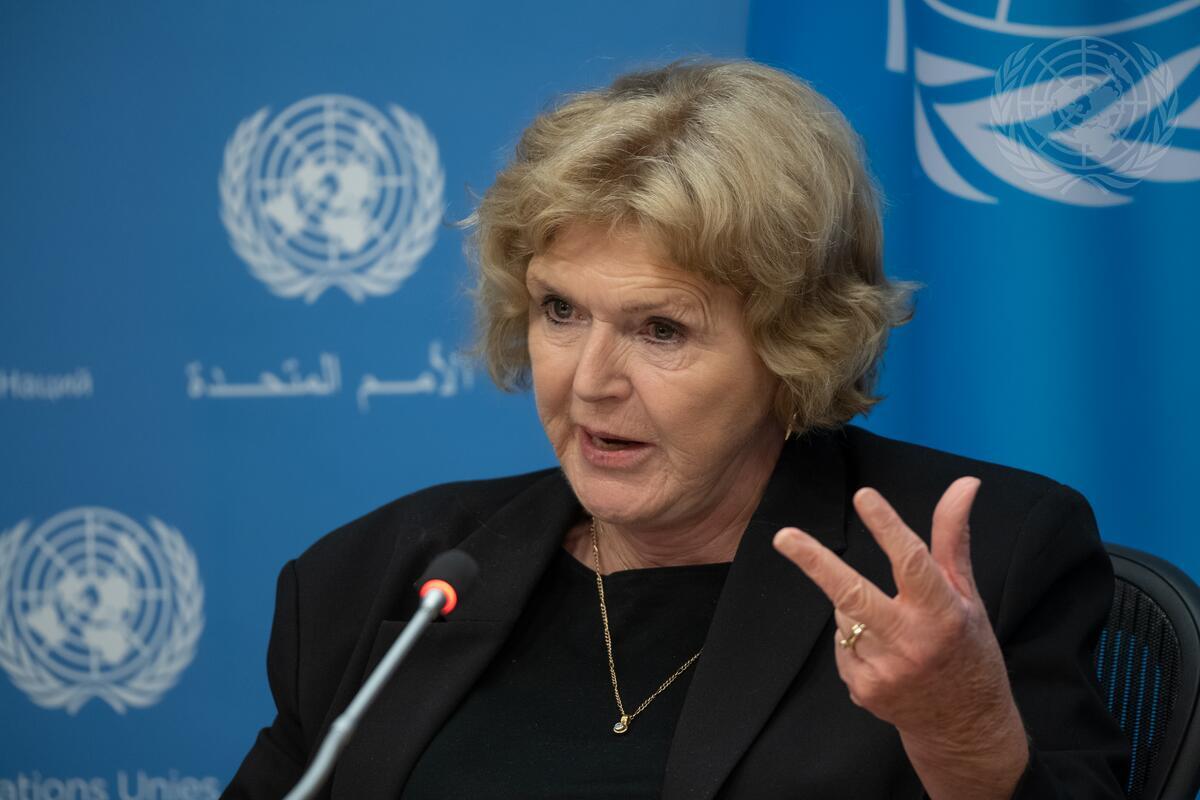 Mary Lawlor, Special Rapporteur on the Situation of Human Rights Defenders, briefs reporters at UN Headquarters. With her was Clément Nyaletsossi Voule (not pictured), Special Rapporteur on the Rights to Freedom of Peaceful Assembly and of Association.