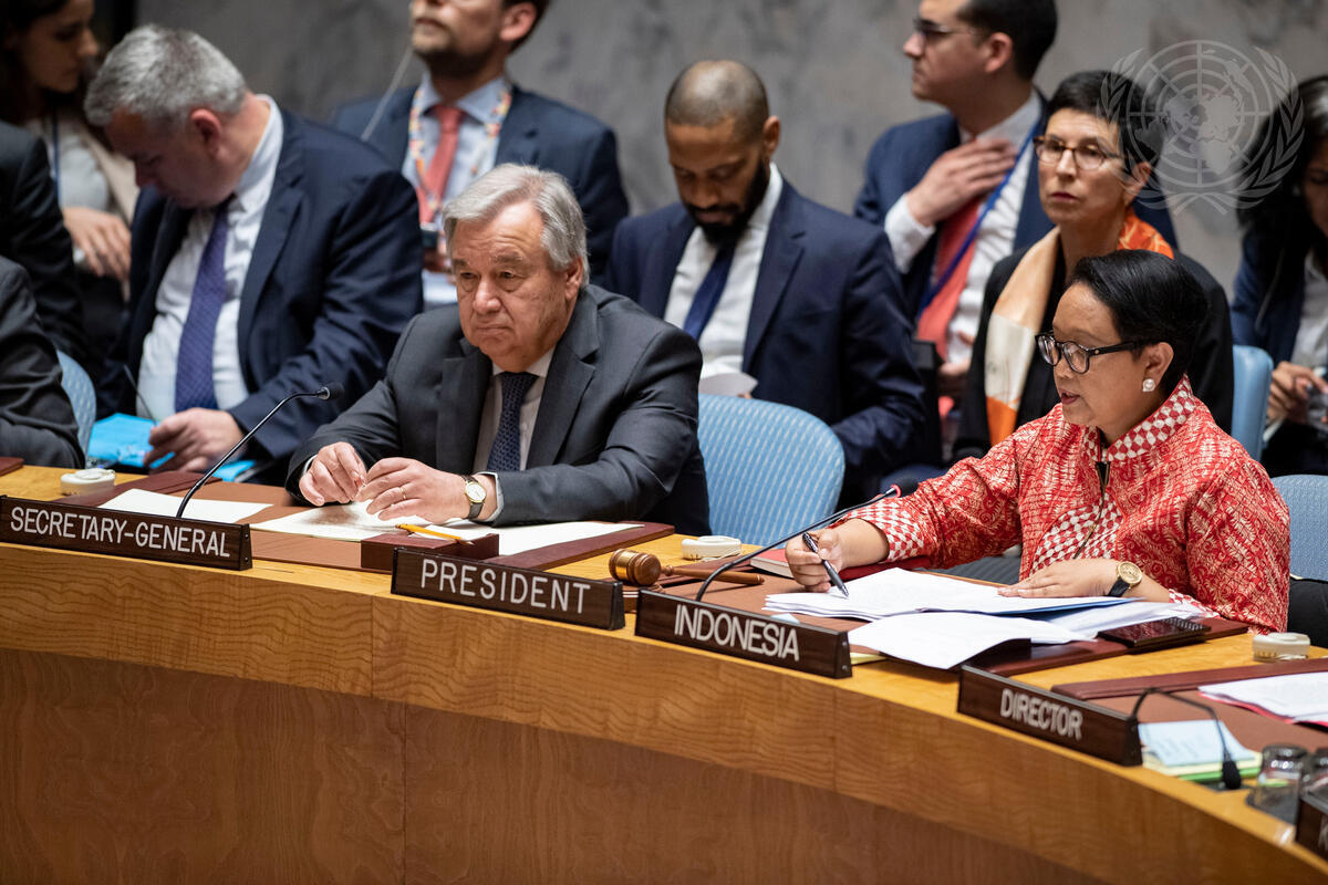 Retno Lestari Priansari Marsudi (right), Minister for Foreign Affairs of the Republic of Indonesia and President of the Security Council for the month of May, chairs the Security Council debate on protection of civilians in armed conflict. At left is Secretary-General António Guterres.