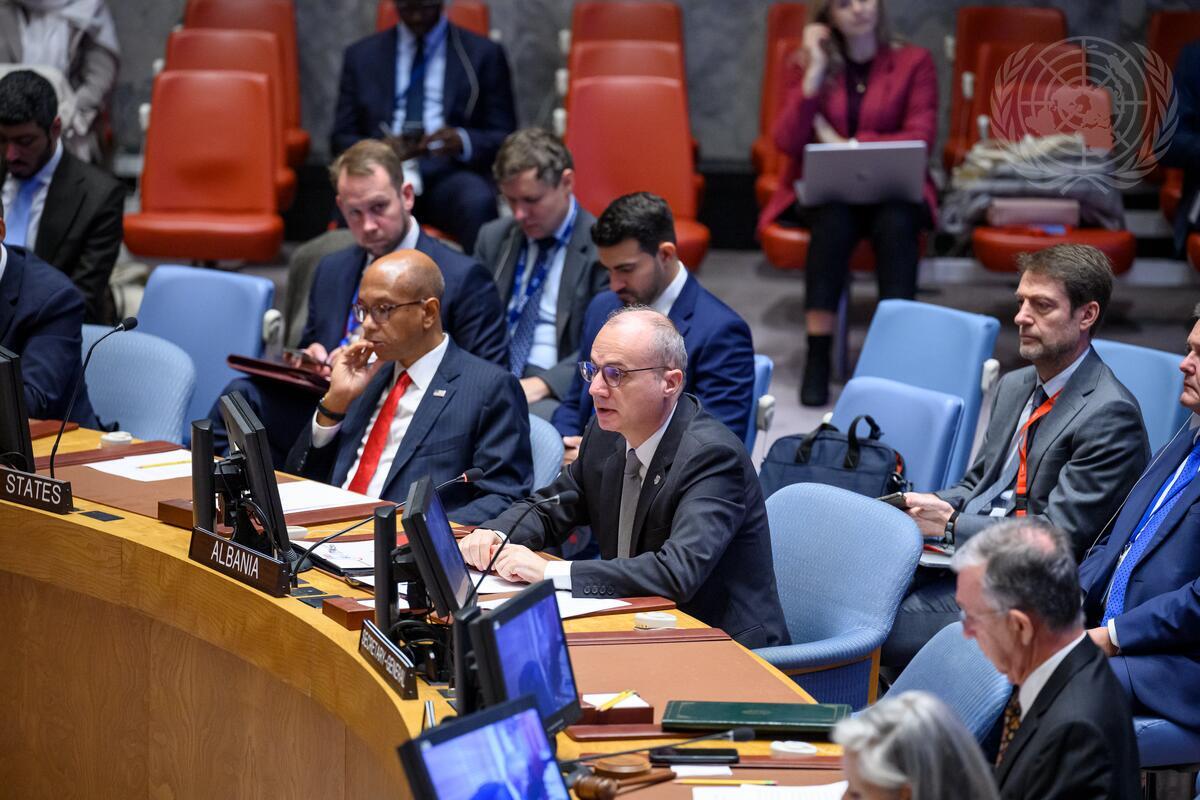 Igli Hasani (centre at table), Minister for Europe and Foreign Affairs of Albania, addresses the Security Council meeting on "Peace through dialogue: the contribution of regional, subregional and bilateral arrangements to the prevention and peaceful resolution of disputes" under maintenance of international peace and security.