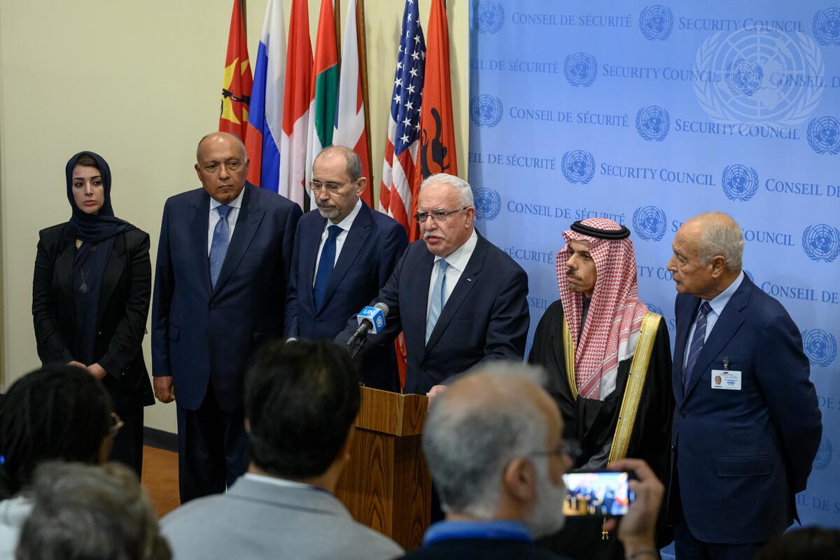 Riad Al-Malki (centre right), Minister for Foreign Affairs of the State of Palestine, briefs reporters on the situation in the Middle East, including the Palestinian question.