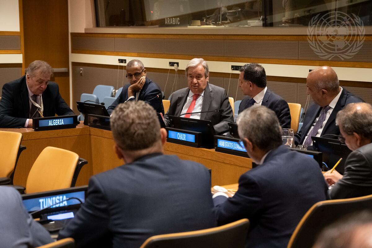 Secretary-General António Guterres (centre) meets with the Permanent Representatives of the Arab Group.
