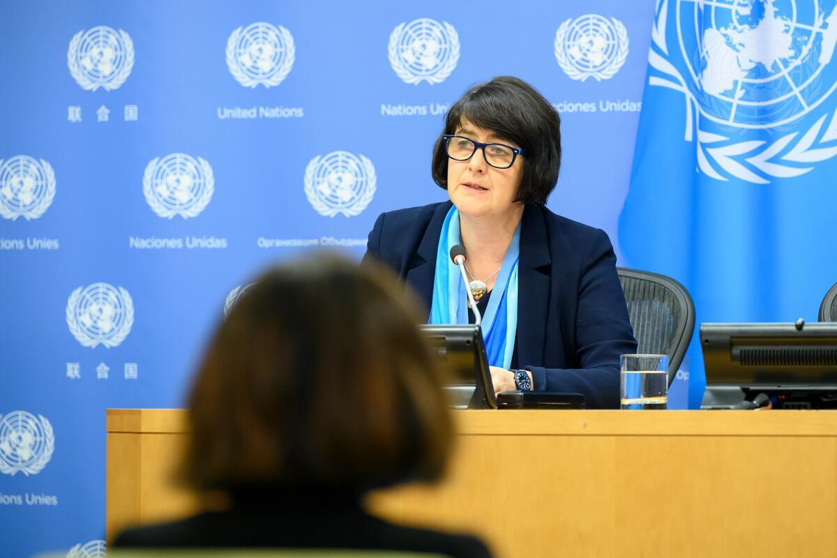 Caption Description Siobhán Mullally, Special Rapporteur on trafficking in persons, especially in women and children, briefs reporters at UN Headquarters.