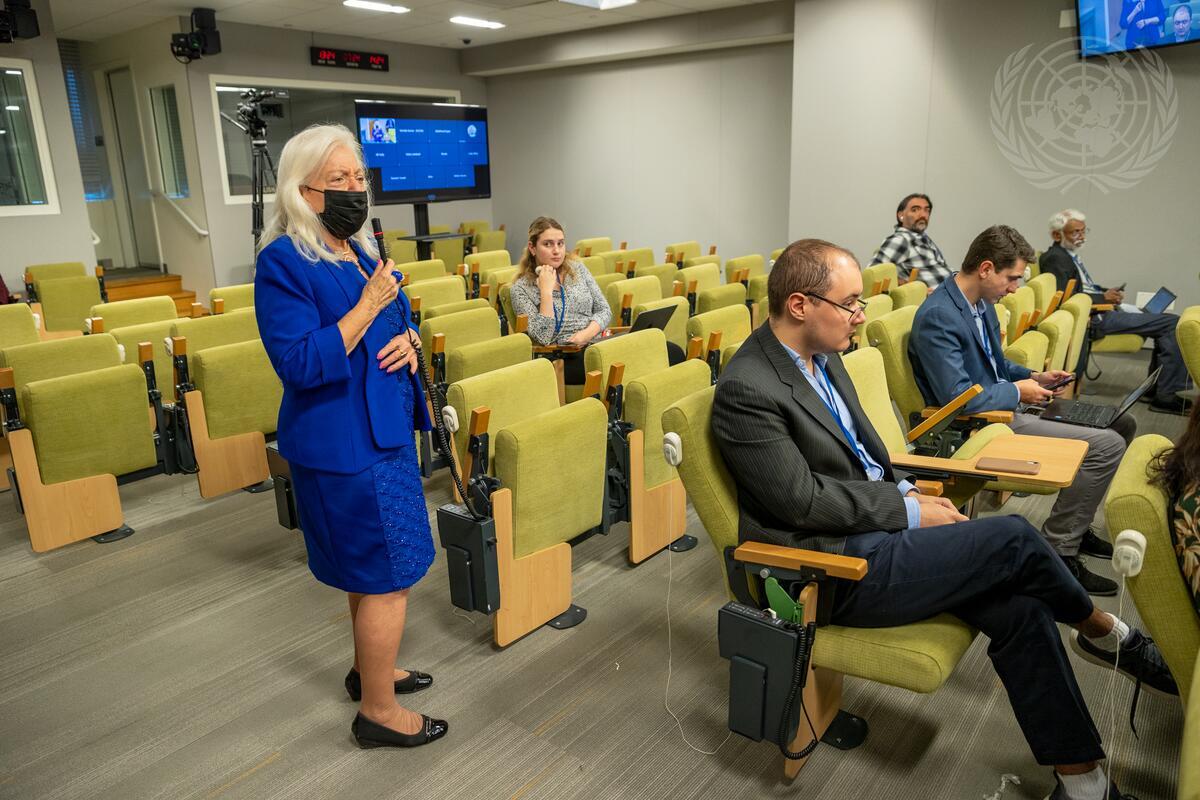 Caption Description Edith Lederer (standing), Associated Press chief correspondent for the United Nations, asks a question during the press briefing on the situation of civilians in Gaza by Riyad Mansour (not pictured), Permanent Observer of the State of Palestine to the United Nations, and Maged A. Abdelaziz (not pictured), Permanent Observer of the League of Arab States to the United Nations.