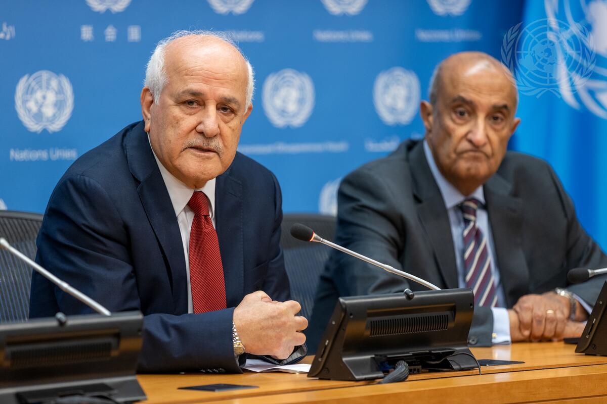 Riyad Mansour (left), Permanent Observer of the State of Palestine to the United Nations, and Maged A. Abdelaziz, Permanent Observer of the League of Arab States to the United Nations, brief journalists on the situation of civilians in Gaza.