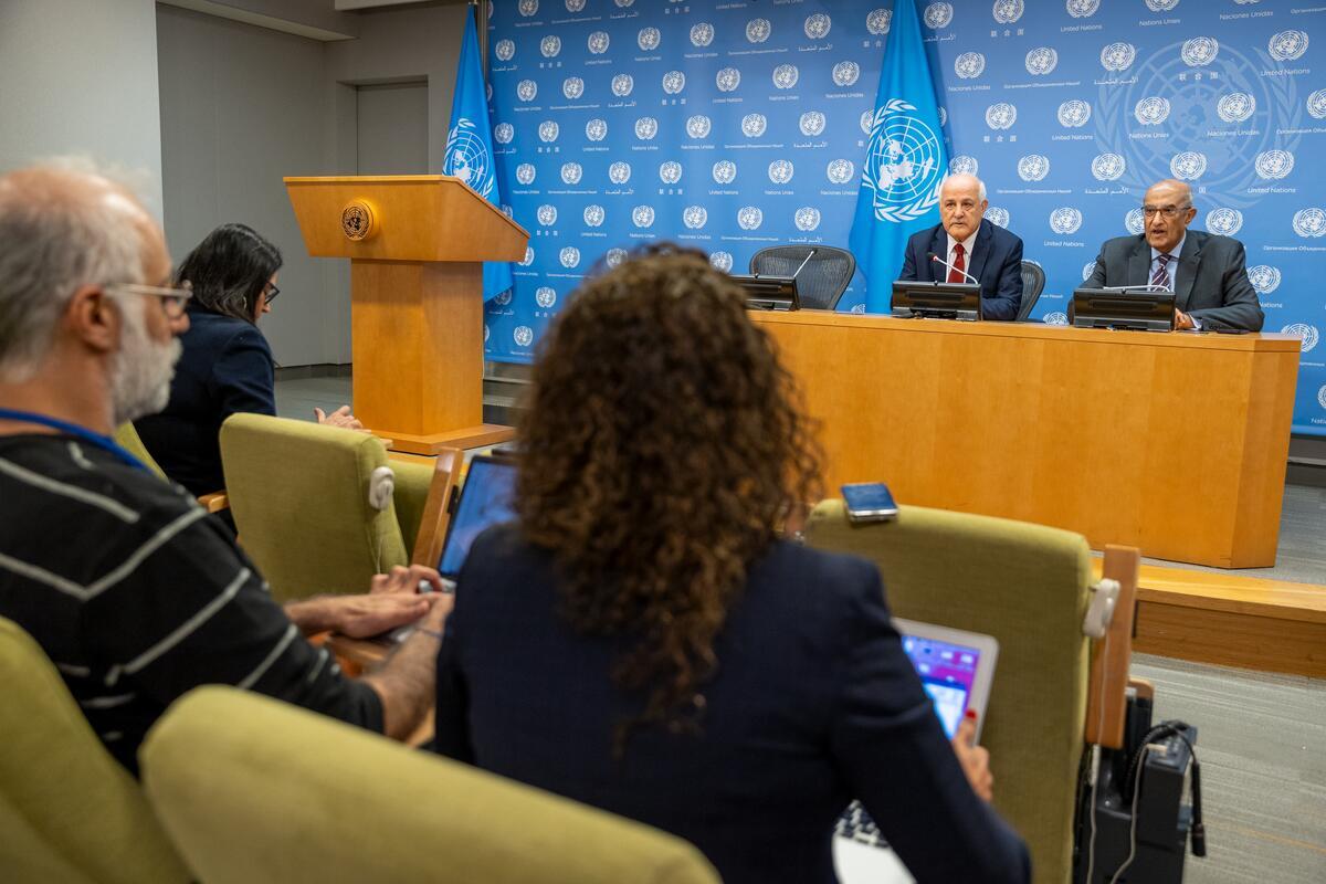Maged A. Abdelaziz (right), Permanent Observer of the League of Arab States to the United Nations, and Riyad Mansour, Permanent Observer of the State of Palestine to the United Nations, brief journalists on the situation of civilians in Gaza.