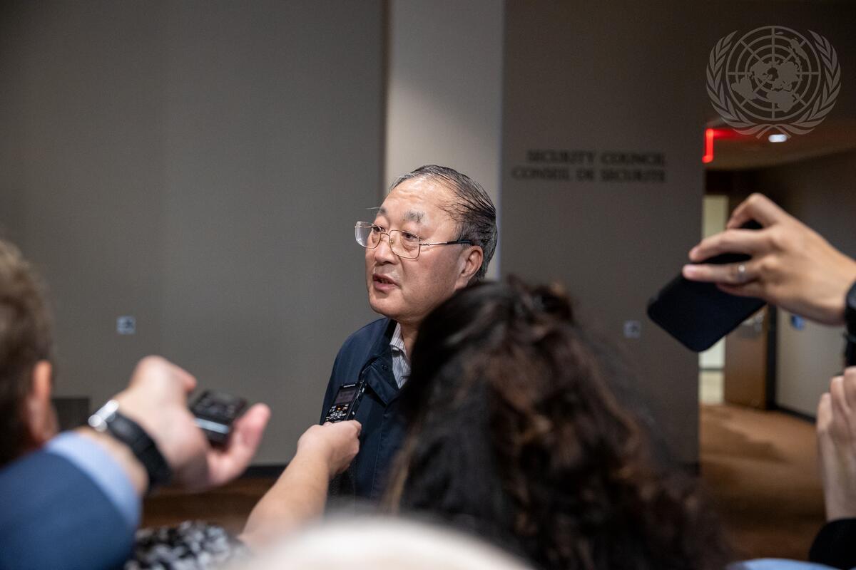 Zhang Jun, Permanent Representative of China to the United Nations, briefs reporters after the closed Security Council meeting on the situation in the Middle East, including the Palestinian question.