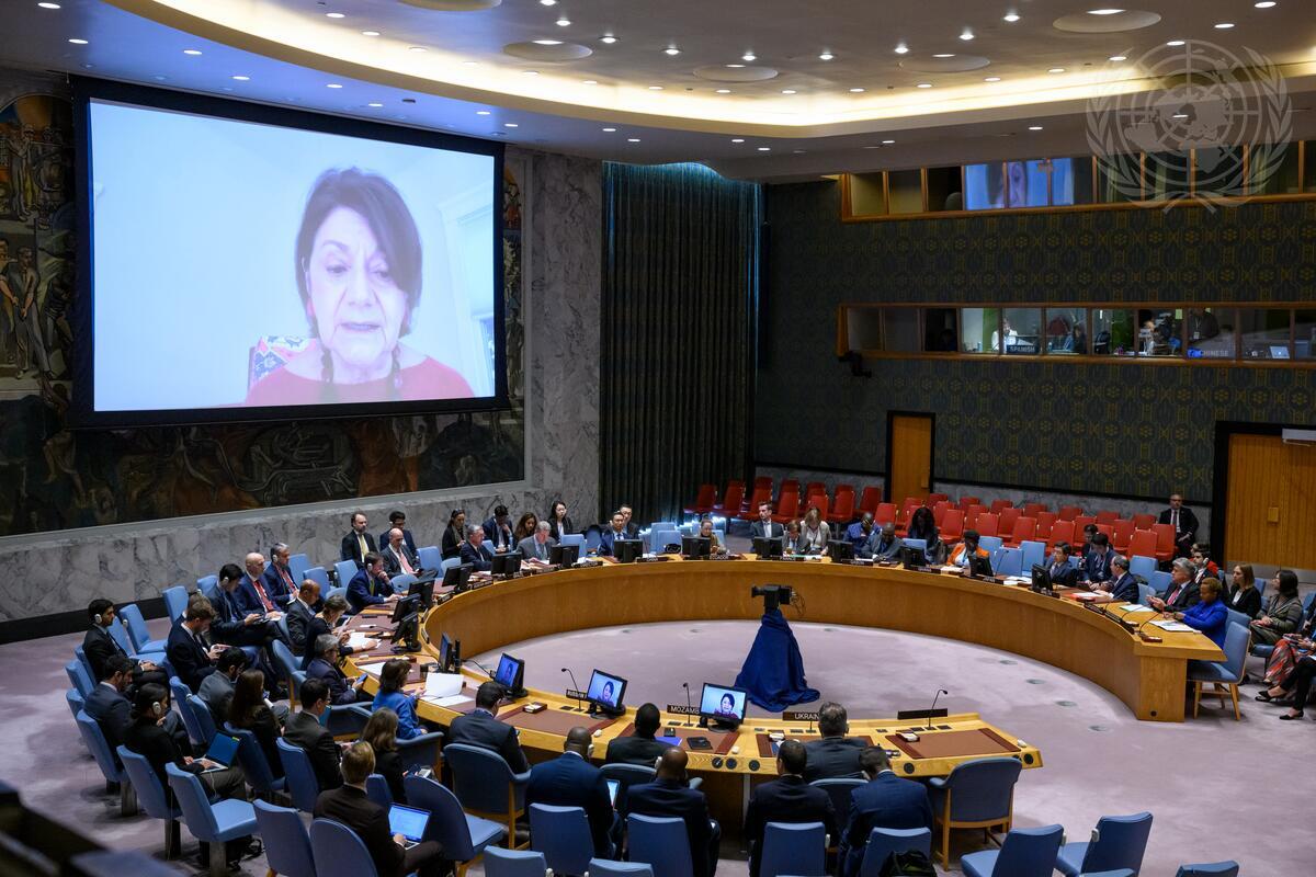 Rosemary DiCarlo (on screen), Under-Secretary-General for Political and Peacebuilding Affairs briefs the Security Council meeting on maintenance of peace and security of Ukraine.