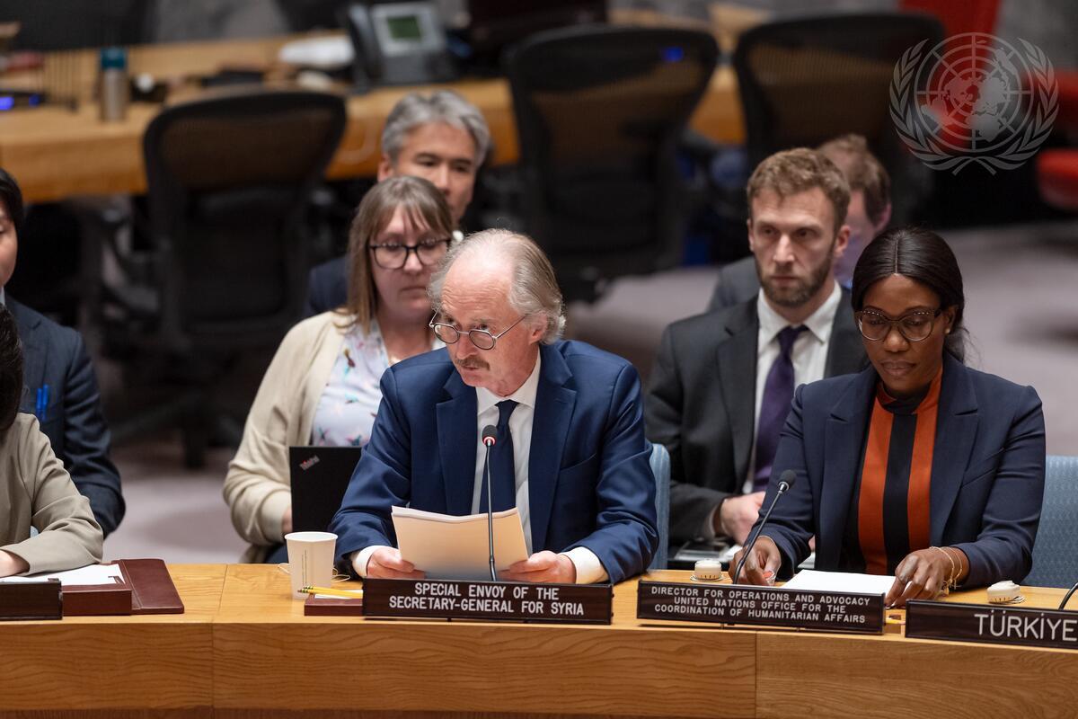 Geir Pedersen (left), Special Envoy of the Secretary-General for Syria, briefs the Security Council meeting on the situation in the Middle East (Syria).