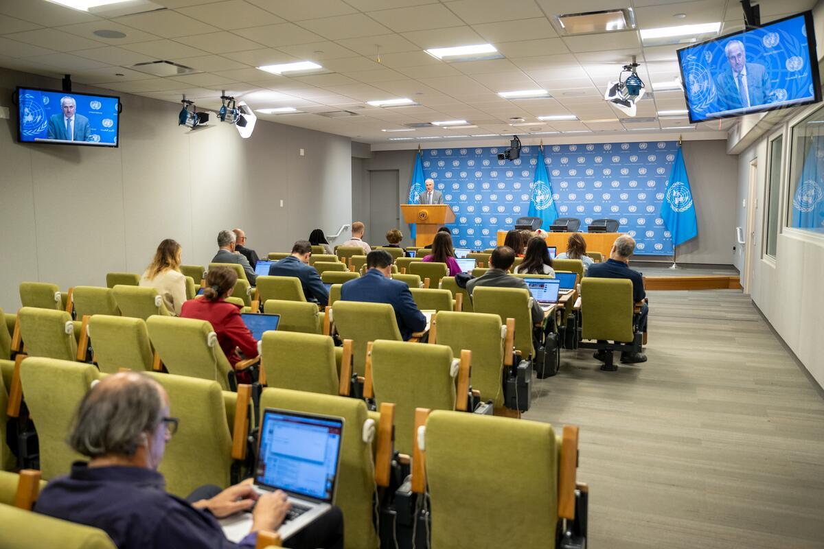 Stéphane Dujarric (at podium), Spokesperson for the Secretary-General, briefs reporters at UN Headquarters.