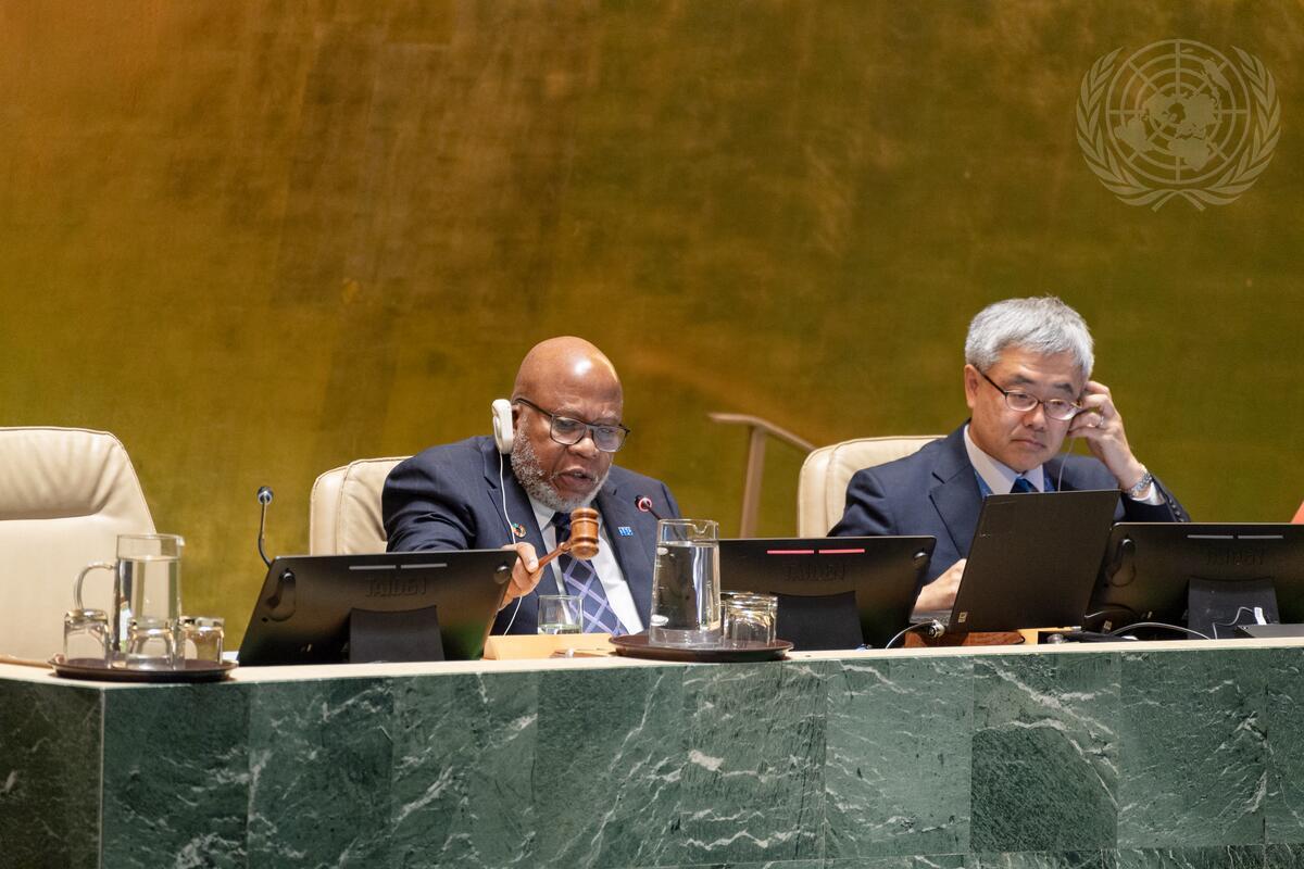 Dennis Francis (left), President of the seventy-eighth session of the General Assembly, chairs the General Assembly plenary meeting on integrated and coordinated implementation of and follow-up to the outcomes of the major United Nations conferences and summits in the economic, social and related fields. The meeting focused on the follow-up to the outcome of the Millennium Summit. At right is Kenji Nakano, Chief of the General Assembly Affairs Branch, Department for General Assembly and Conference Management (DGACM).
