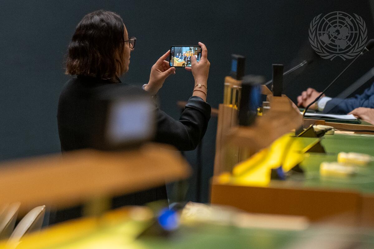 A view of a delegate taking a photo in the General Assembly Hall on the sixth day of 78th General Assembly Debate.