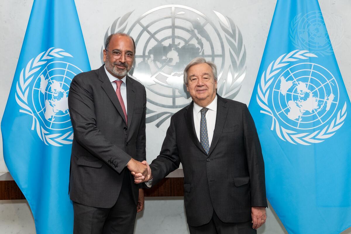 Secretary-General António Guterres (right) meets with Imran Riza, Deputy Special Coordinator, Resident Coordinator and Humanitarian Coordinator for Lebanon.