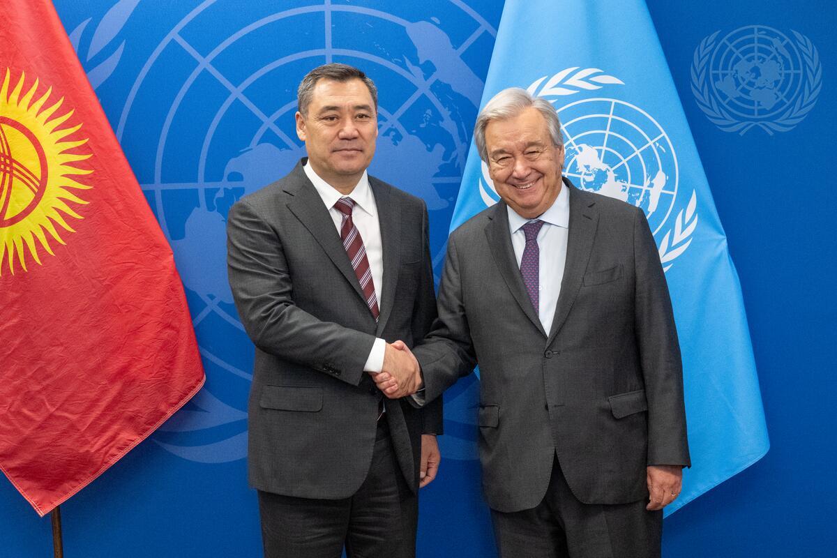 Secretary-General António Guterres (right) meets with Sadyr Zhaparov, President of the Kyrgyz Republic.