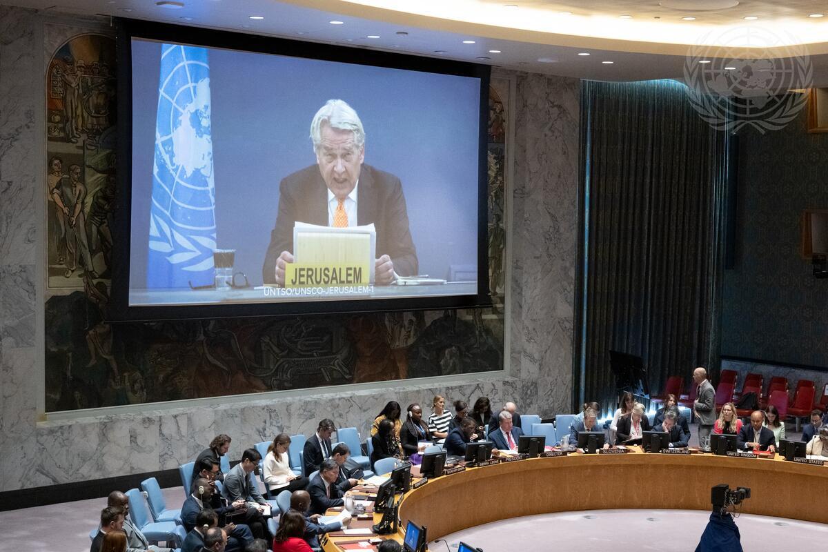 Tor Wennesland (on screen), Special Coordinator for the Middle East Peace Process and Personal Representative of the Secretary-General, briefs the Security Council meeting on the situation in the Middle East, including the Palestinian question.