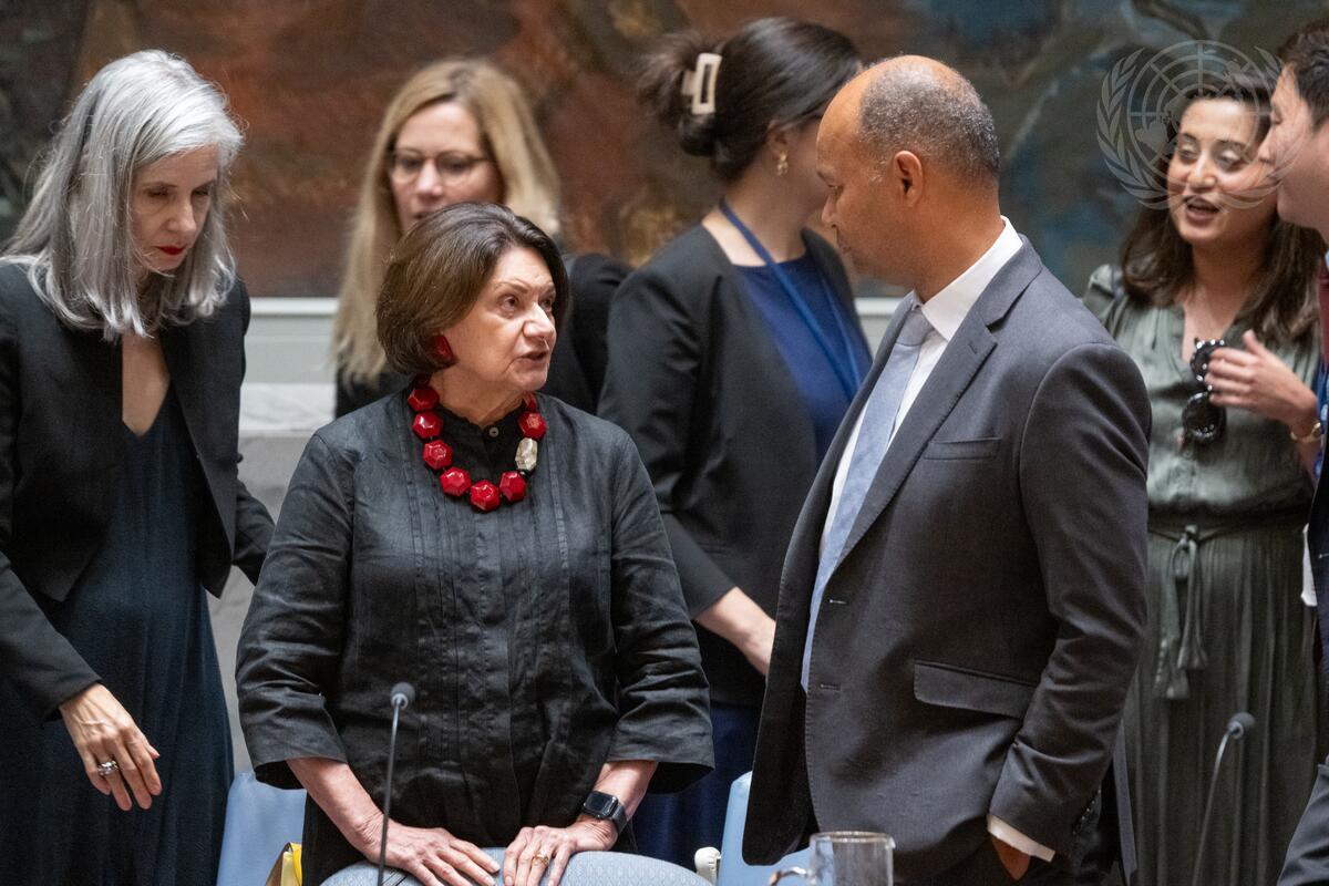 Rosemary DiCarlo (centre left), Under-Secretary-General for Political and Peacebuilding Affairs, speaks with James Kariuki (centre right), Deputy Permanent Representative of the United Kingdom to the United Nations, prior to the Security Council meeting on the situation in the Middle East, including the Palestinian question.