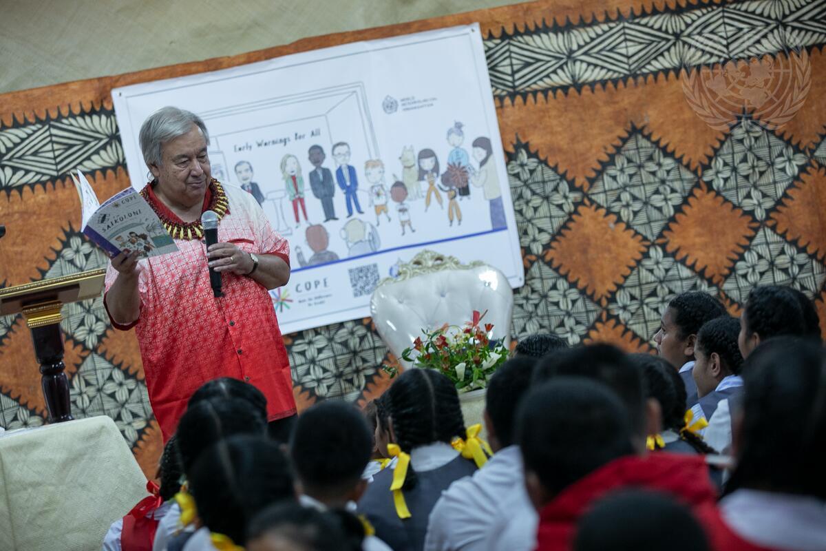 Secretary-General António Guterres speaks to students at the GPS Fasi School in Nuku'alofa. In his hand is the booklet ’Tonga COPE Series on Tropical Cyclones’ which contains information on helping children cope with natural hazards and disaster.