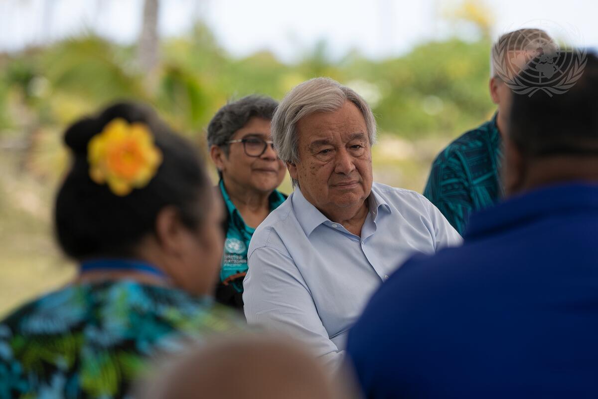 Secretary-General António Guterres (centre) hears stories of the Tsunami from members of the community during his visit to the Ha'atafu Beach Resort on the west coast of Tongatapu. The resort was destroyed by the tsunami that hit Tonga in January 2022.
