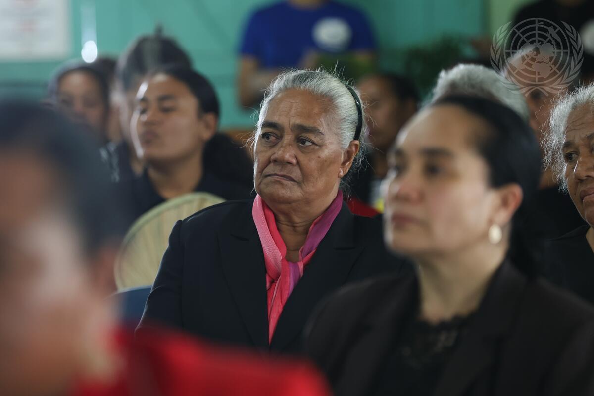 Community members from the villages of Kanokupolu and 'Atata Si'i on the west coast of Tongatapu attends a meeting with Secretary-General António Guterres (not pictured). The area was destroyed by the tsunami that hit Tonga in January 2022.