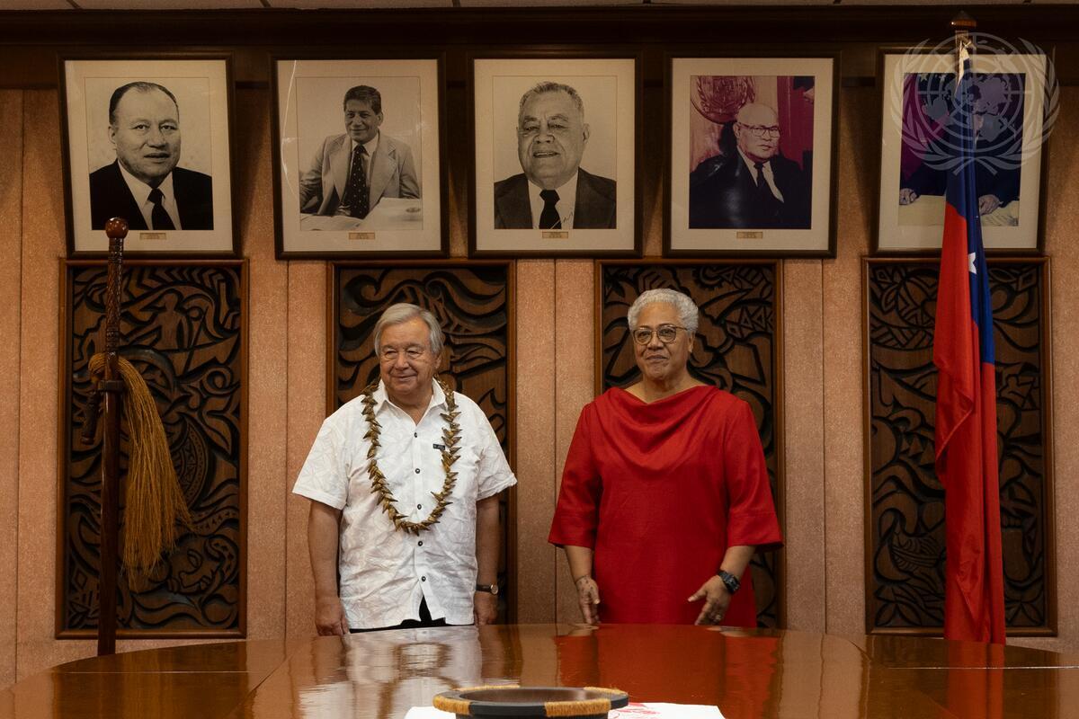 UN Secretary-General António Guterres (left) meets with Samoa Prime Minister Fiame Naomi Mata'afa, during a trip to Samoa.