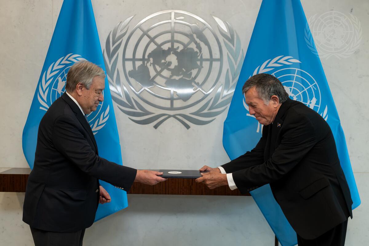 John Silk (right), Permanent Representative of the Republic of the Marshall Islands to the United Nations, presents his credentials to Secretary-General António Guterres.