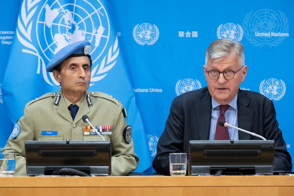 Jean-Pierre Lacroix (right), Under-Secretary-General for Peace Operations, and Faisal Shahkar, United Nations Police Adviser, brief reporters on the fourth United Nations Chiefs of Police Summit (UNCOPS 2024), which will take place at UN Headquarters on 26 - 27 June 2024.