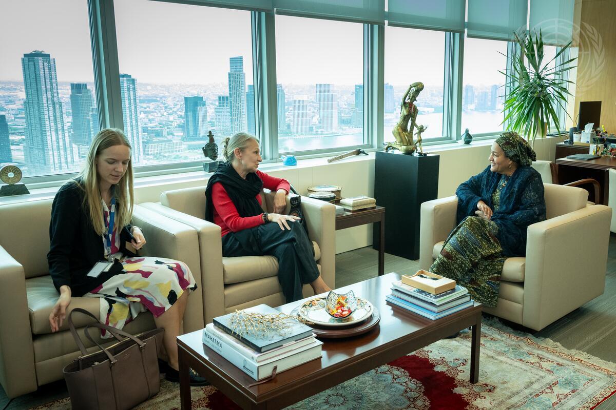 Deputy Secretary-General Amina Mohammed (right) meets with Tiina Intelmann (centre), Special Envoy for Multilateralism and Mediation of the Estonian Ministry of Foreign Affairs of the Republic of Estonia.