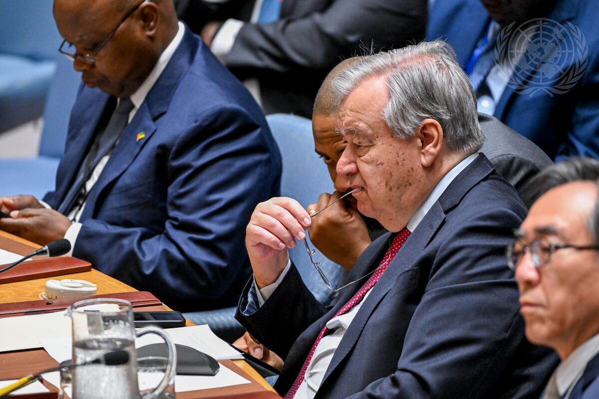 A view of UN Secretary-General António Guterres attending the Security Council meeting on addressing evolving threats in cyberspace.
