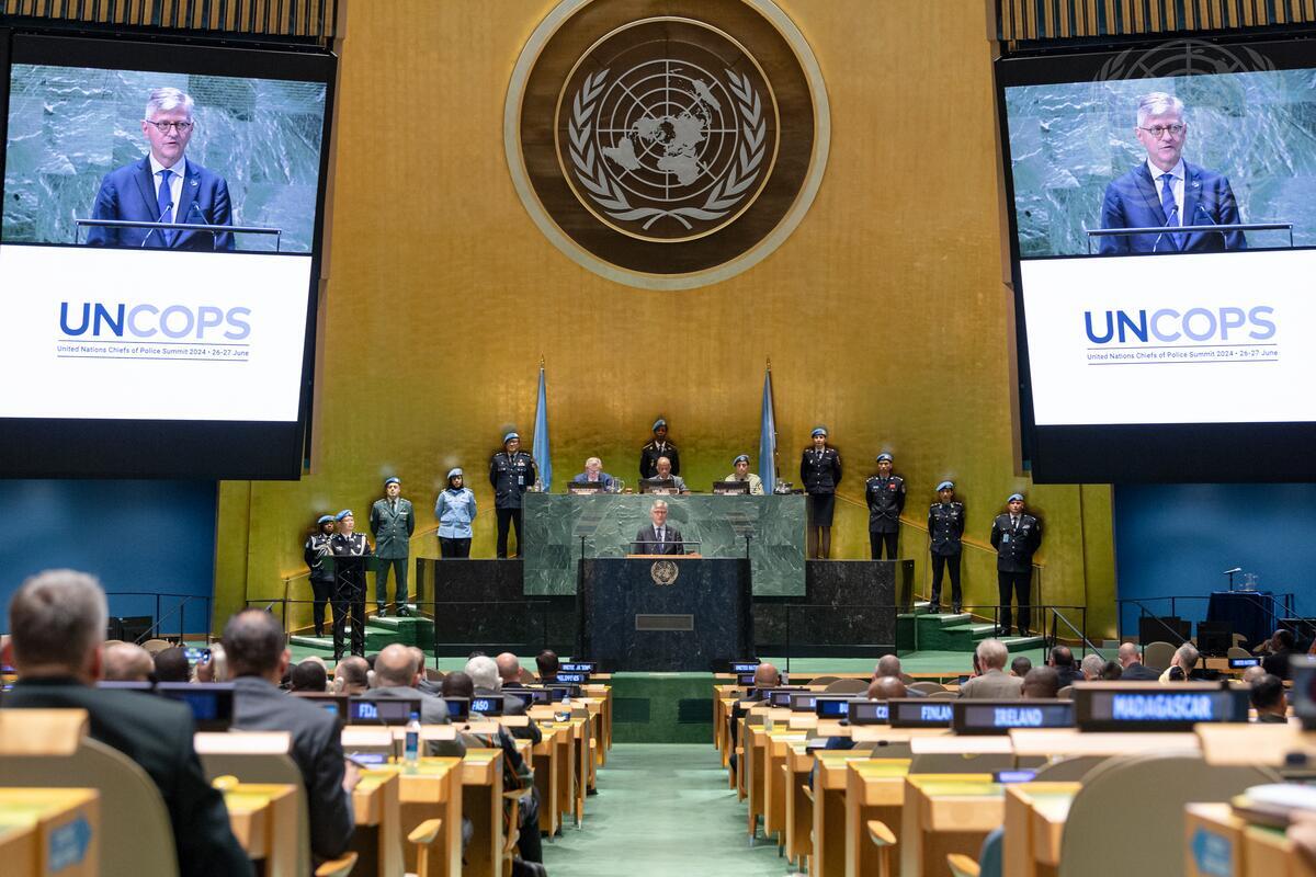 Jean-Pierre Lacroix (at podium and on screens), Under-Secretary-General for Peace Operations, addresses the closing of the United Nations Chiefs of Police Summit (UNCOPS 2024).