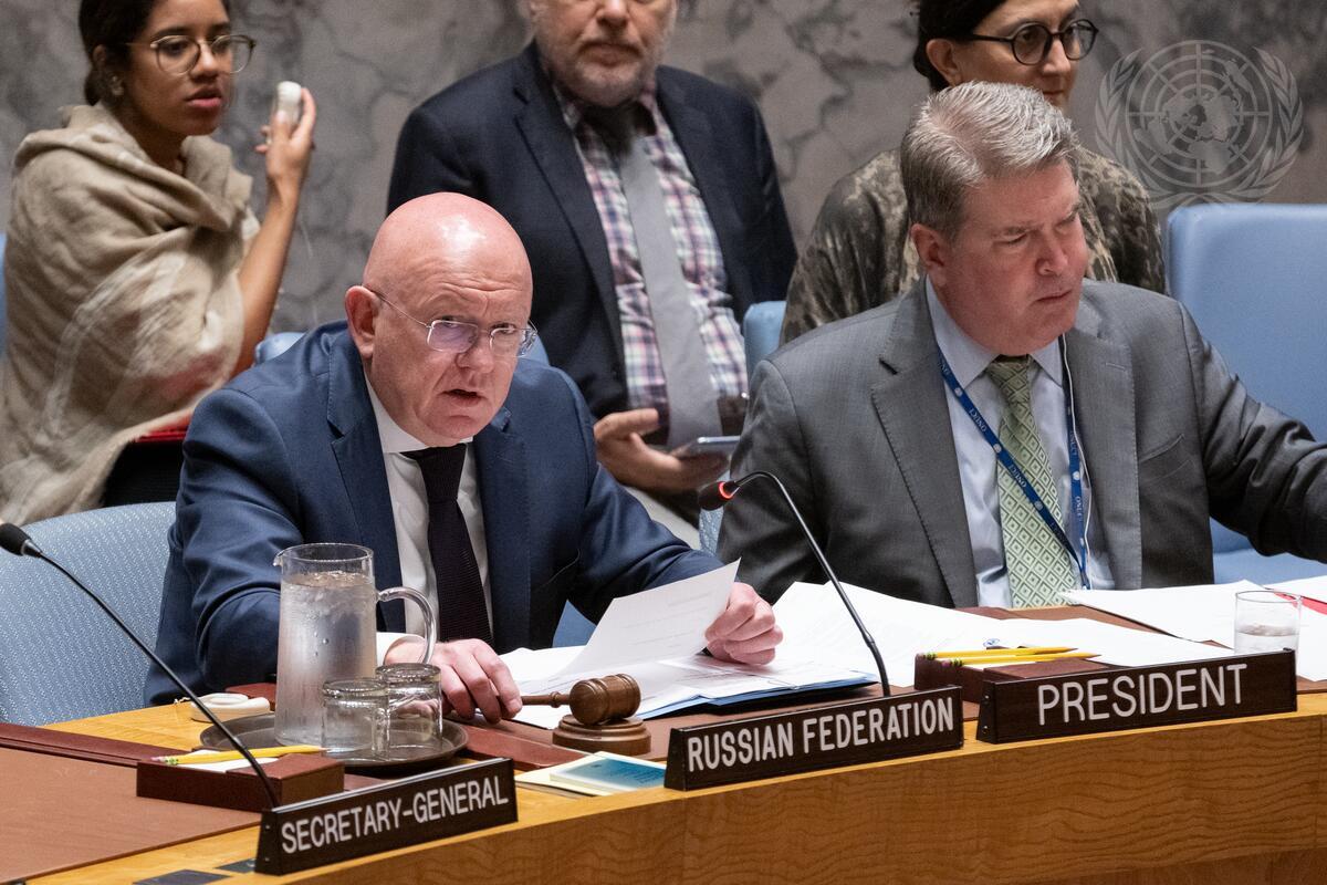 Vassily Nebenzia (left at table), Permanent Representative of the Russian Federation and President of the Security Council for the month of July, chairs the Security Council meeting on the situation in the Middle East (Yemen).