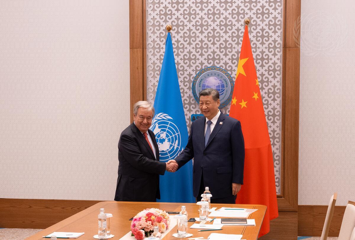 Secretary-General António Guterres (left) meets with Xi Jinping, President of the People's Republic of China, at the Shanghai Cooperation Organisation (SCO) Summit in Kazakhstan.