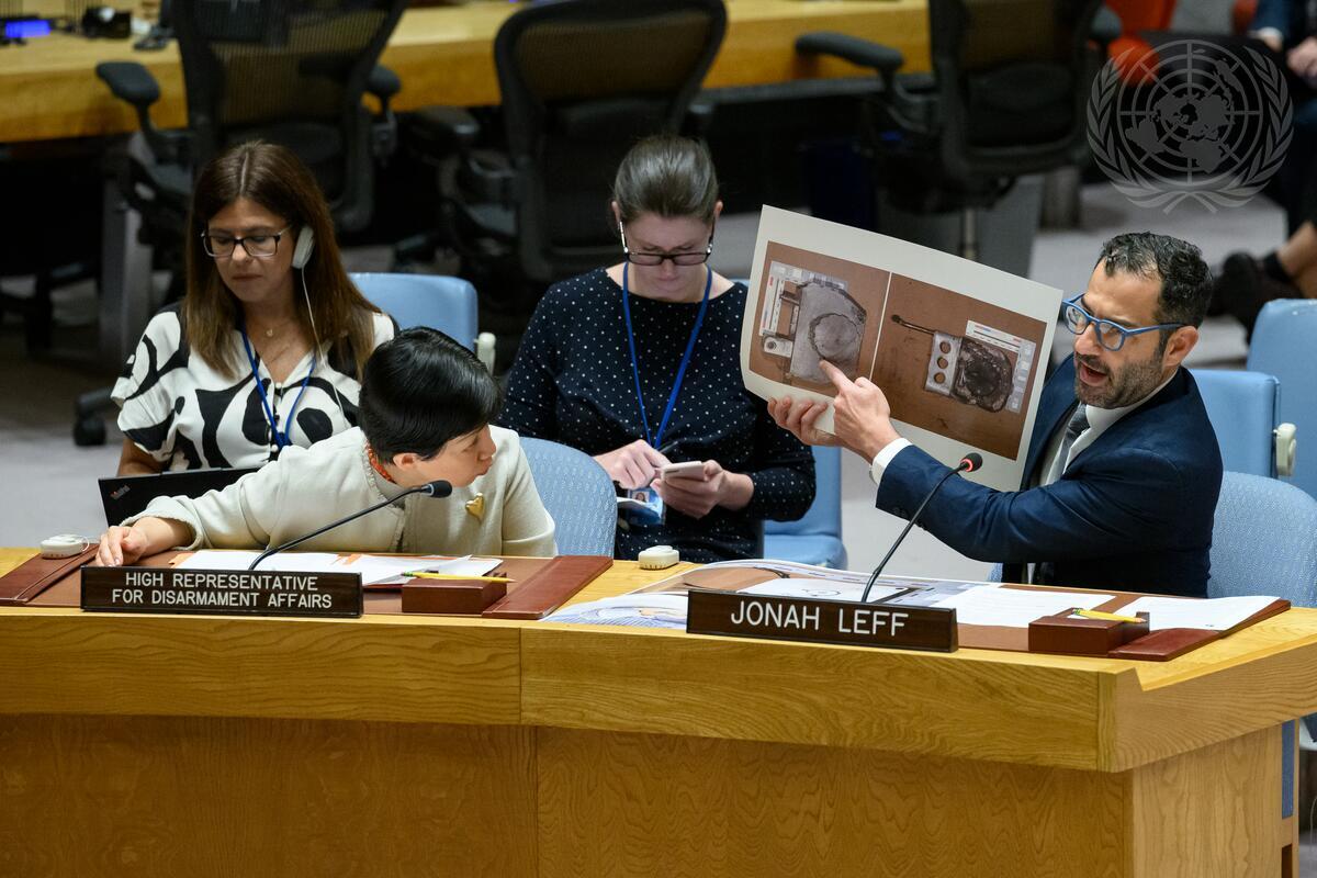 Jonah Leff (right), Executive Director of Conflict Armament Research, briefs the Security Council meeting on non-proliferation and Democratic People’s Republic of Korea. At left is Izumi Nakamitsu, High Representative for Disarmament Affairs.