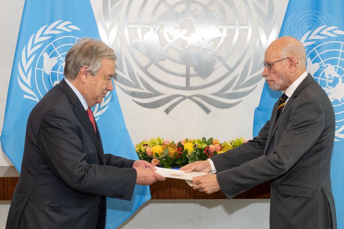 Fred Sarufa (right), Permanent Representative of the Independent State of Papua New Guinea to the United Nations, presents his credentials to Secretary-General António Guterres.