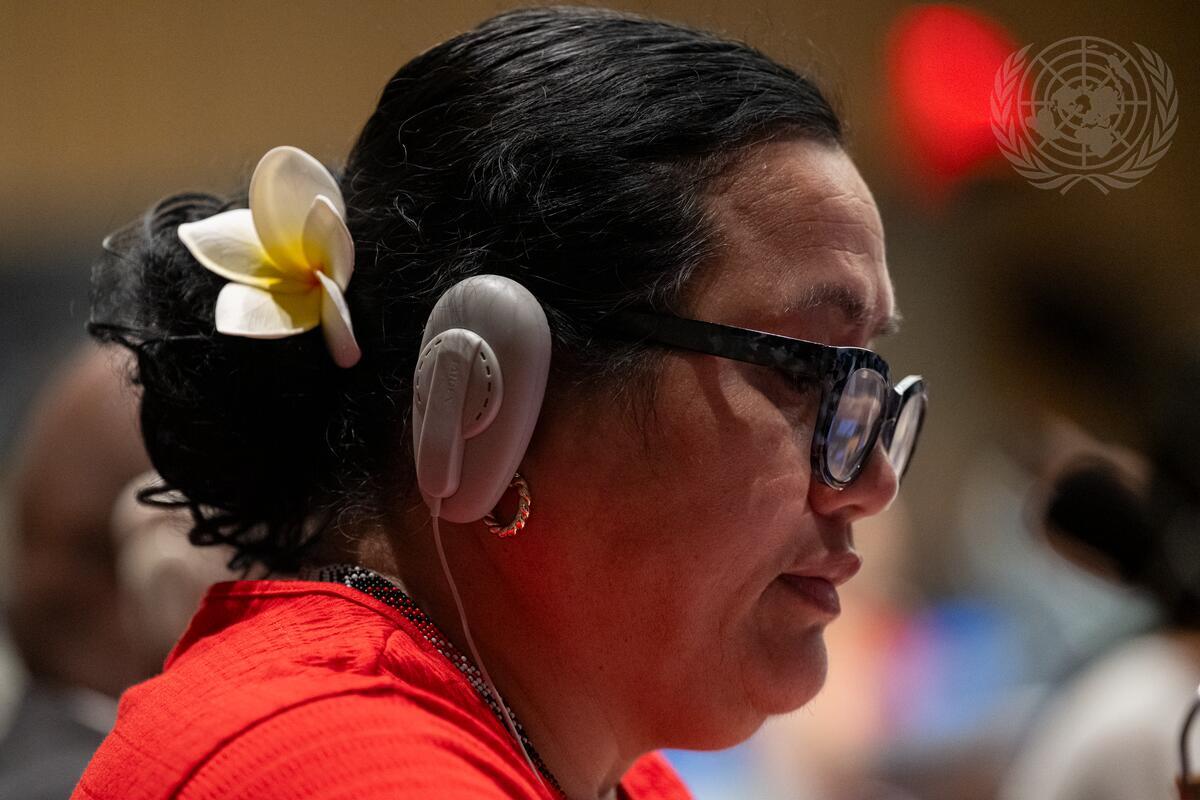 A participant attends the meeting on Sustainable Development Goal (SDG) 1, No poverty, and interlinkages with other SDGs.