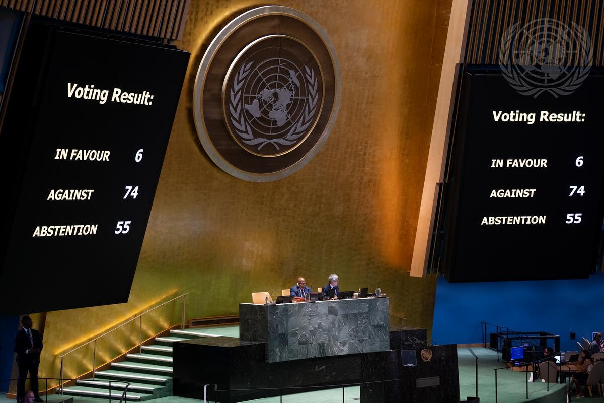 The General Assembly votes on an amendment on the "Establishment of the list of speakers for the Summit of the Future", put forth by the Russian Federation, to a draft resolution under the theme, strengthening of the United Nations system, during the 98th plenary meeting of the General Assembly. The amendment was not adopted, having failed to obtain enough votes in favour.