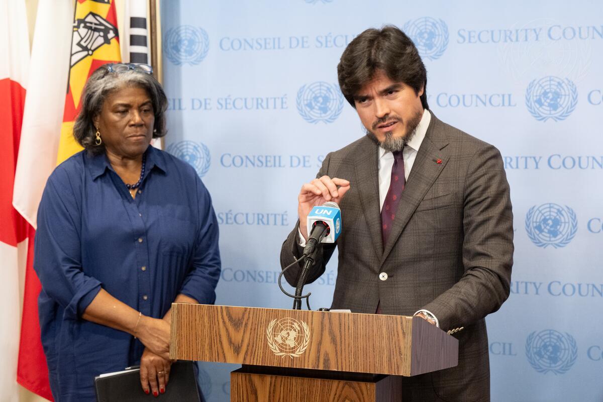 José Javier De La Gasca (at podium), Permanent Representative of Ecuador to the United Nations, briefs reporters on the mandate renewal of the United Nations Integrated Office in Haiti (BINUH). At left is Linda Thomas-Greenfield, Permanent Representative of the United States to the United Nations.