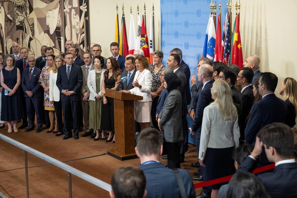 Tanja Fajon (at podium), Deputy Prime Minister and Minister of Foreign and European Affairs of Slovenia, briefs reporters on the United Nations Relief and Works Agency for Palestine Refugees in the Near East (UNRWA) shared commitments. With her was Philippe Lazzarini, Commissioner-General of the United Nations Relief and Works Agency for Palestine Refugees in the Near East (UNRWA), and other Representatives.