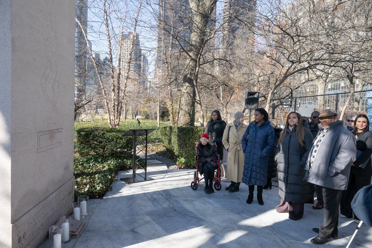 A view of participants by the Eleanor Roosevelt Memorial. At right in front is Dennis Francis, President of the seventy-eighth session of the General Assembly.
