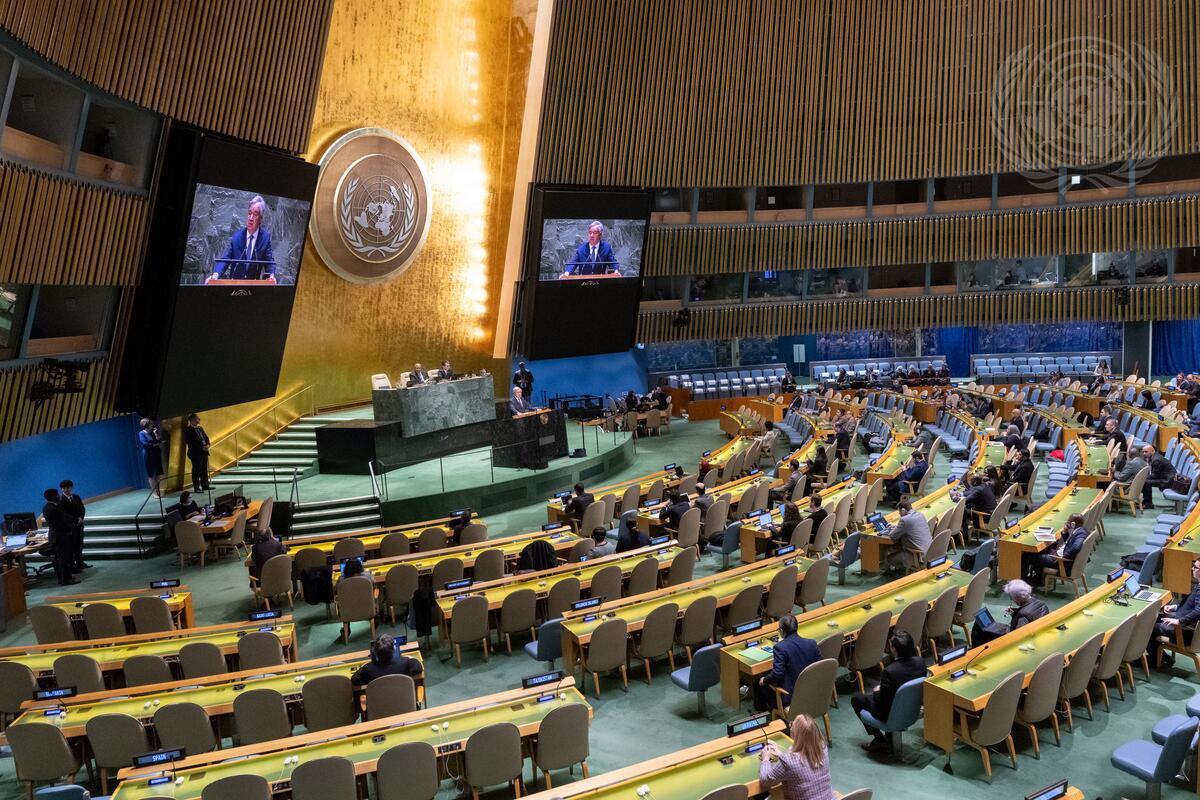 A wide view of the General Assembly Hall as Secretary-General António Guterres (at podium and on screens) addresses the General Assembly informal meeting of the plenary to mark 75th anniversary of the Universal Declaration of Human Rights and Awards Ceremony for UN Prizes in the field of Human Rights for 2023.