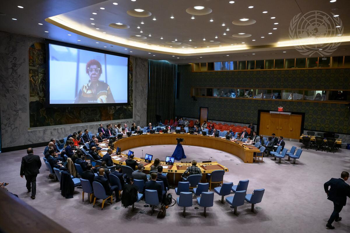 A wide view of the Security Council meeting on small arms and the threat posed by diversion, illicit trafficking and misuse of small arms and light weapons and their ammunition to peace and security. On the screen is Folade Mutota, Executive Director of Women’s Institute for Alternative Development (WINAD).