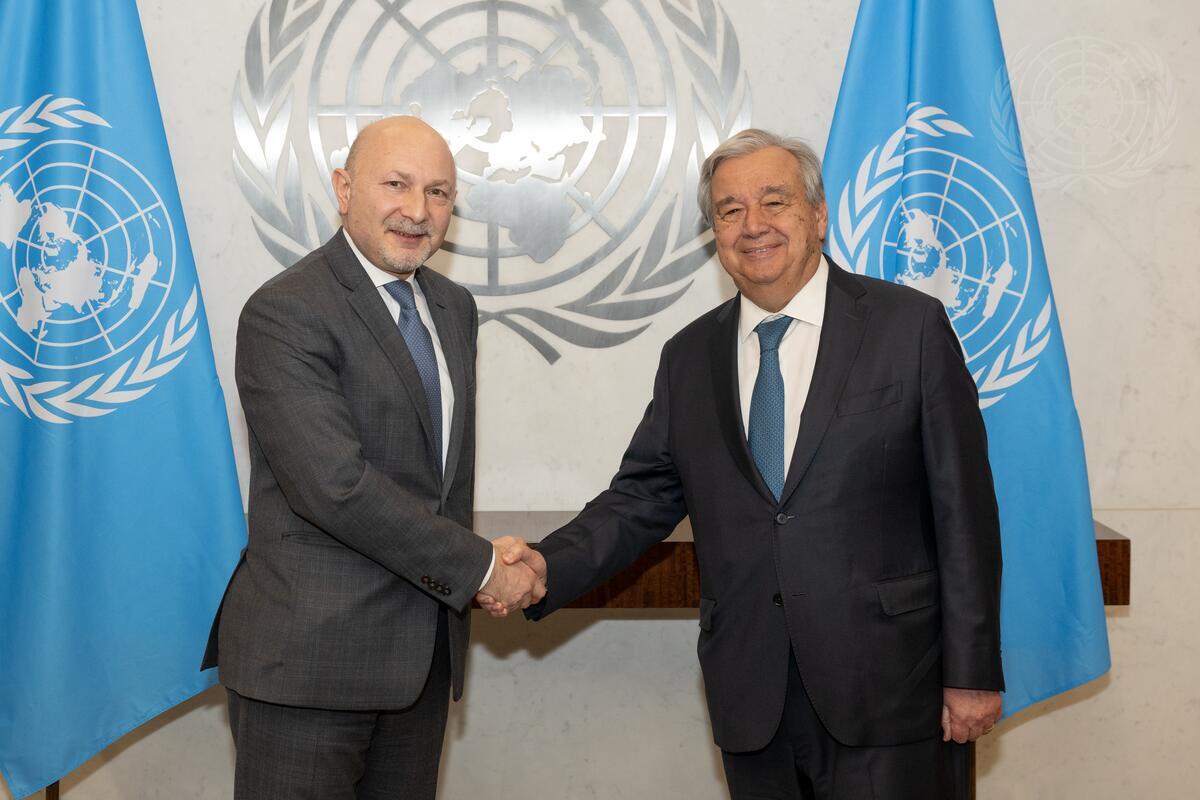 Secretary-General António Guterres (right) meets with Kaha Imnadze, Special Representative of the United Nations Secretary-General for Central Asia, the Head of the UN Regional Centre for Preventive Diplomacy for Central Asia (UNRCCA).