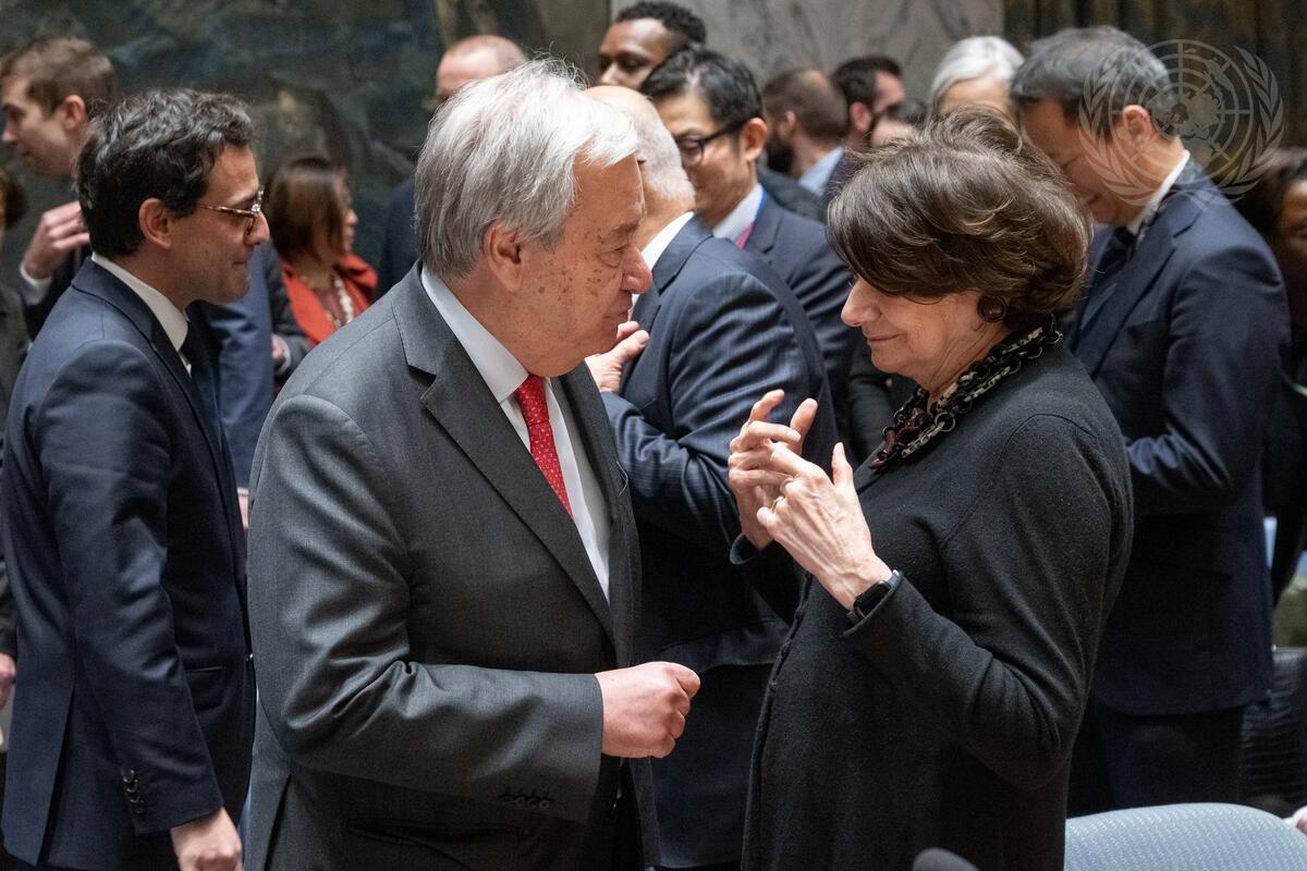 Secretary-General António Guterres (centre left) speaks with Rosemary DiCarlo, Under-Secretary-General for Political and Peacebuilding Affairs, ahead of the Security Council meeting on the situation in the Middle East, including the Palestinian question.