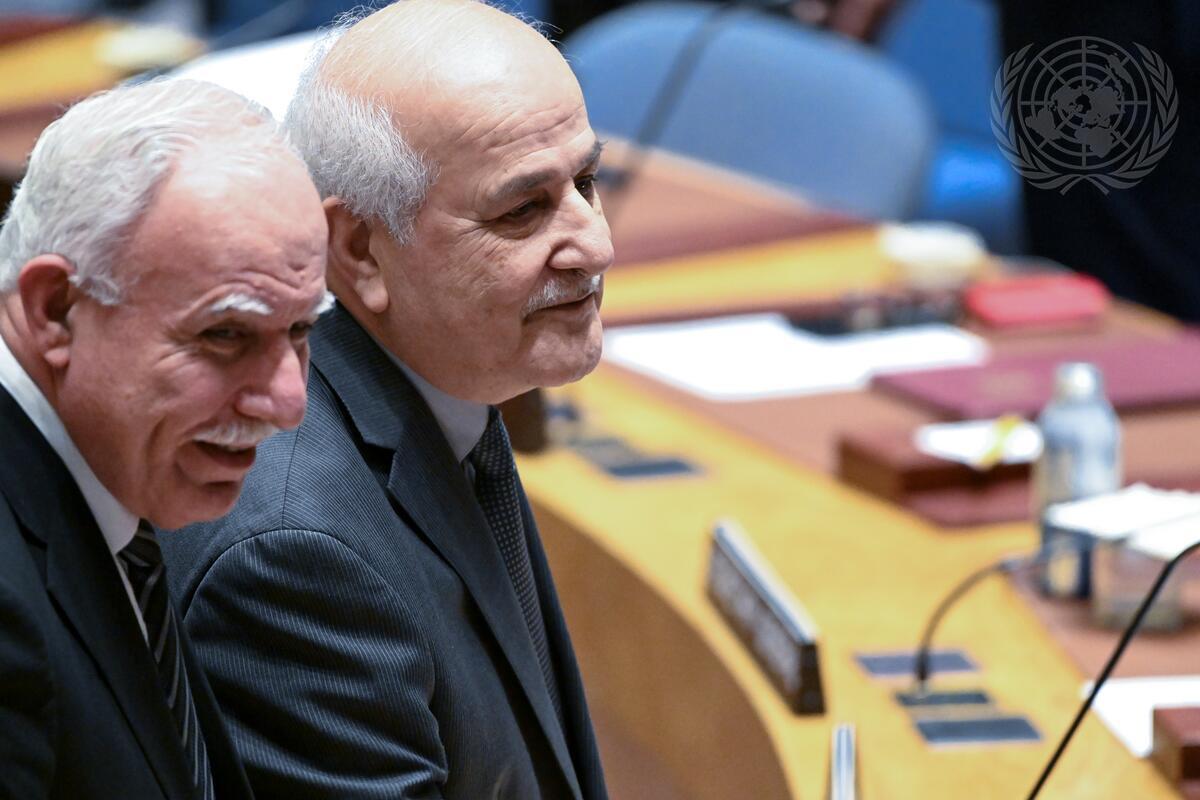 A view of Riad Al-Malki (left), Minister of Foreign Affairs and Expatriates of the State of Palestine, and Riyad Mansour, Permanent Observer of the State of Palestine to the United Nations, in the Security Council Chamber ahead of the meeting on the situation in the Middle East, including the Palestinian question.