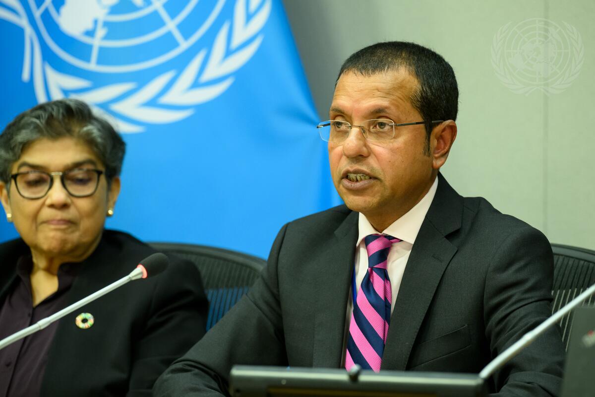 Ali Naseer Mohamed, Representative of Maldives to the United Nations and Co-chair of the Small Island Developing States (SIDS4) Preparatory Committee, briefs reporters on the 4th International Conference on Small Island Developing States (SIDS4) Conference. At left is Rabab Fatima, Under Secretary-General and High Representative for the Least Developed Countries, Landlocked Developing Countries and Small Island Developing States.