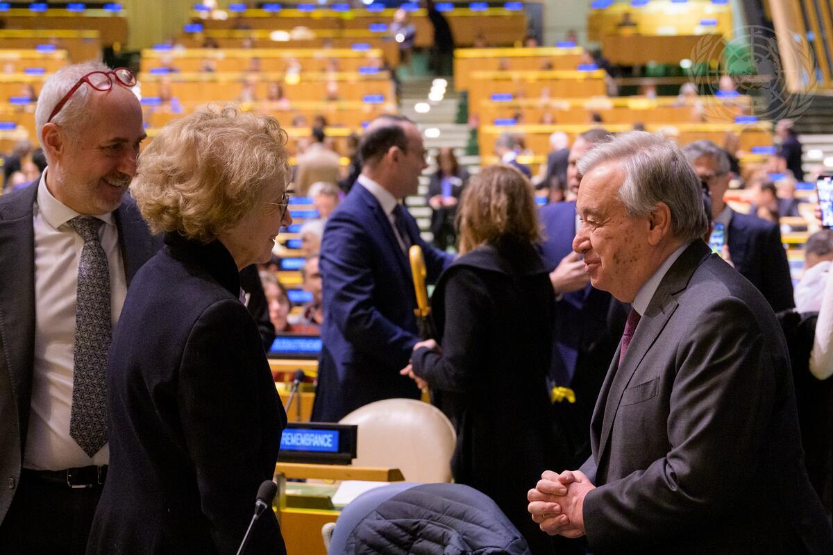 Secretary-General António Guterres (right) speaks with a participant ahead of the United Nations Holocaust Memorial Ceremony, held in observance of the International Day of Commemoration in memory of the victims of the Holocaust (27 January). The event is organized by the Holocaust and the United Nations Outreach Programme. At left is Stéphane Dujarric, Spokesperson for the Secretary-General.